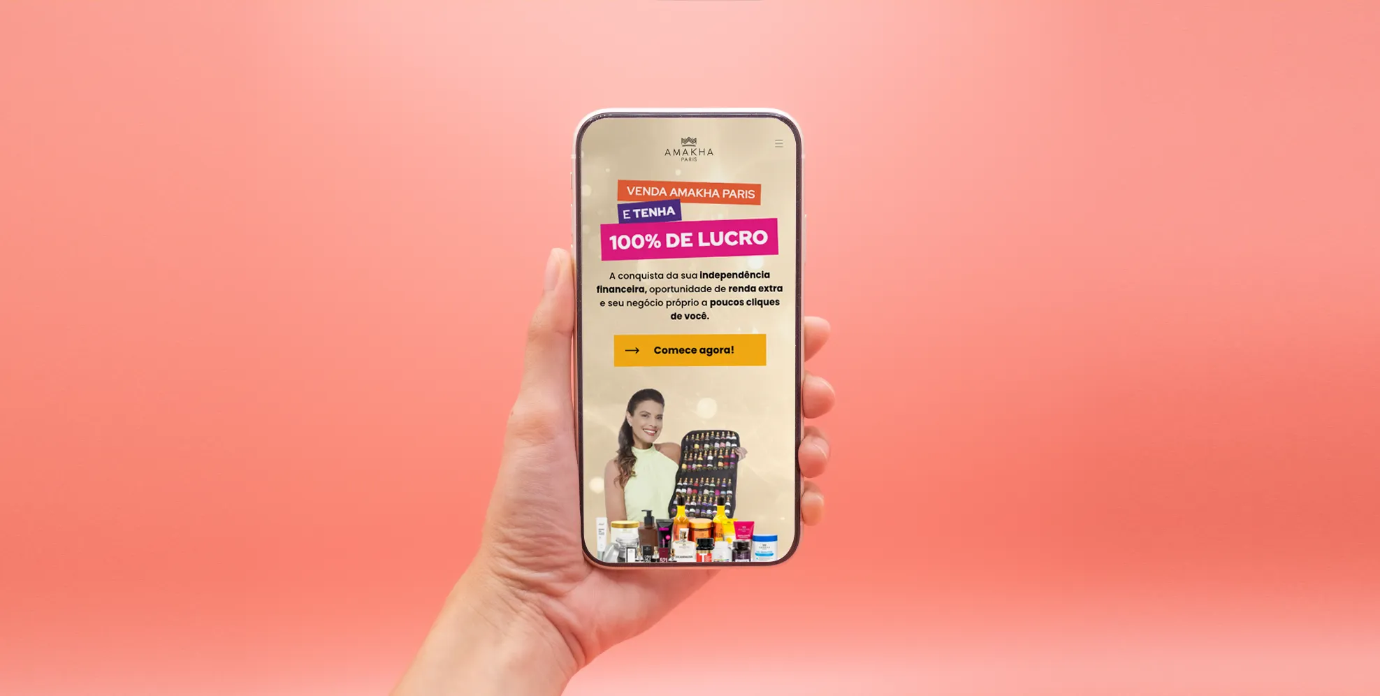 A Amakha Paris buscava uma forma mais eficiente de atrair novas revendedoras e comunicar, de maneira clara e objetiva, os benefícios do seu programa de empreendedorismo. O time comercial precisava de uma ferramenta digital capaz de aumentar as conversões, melhorar a jornada de cadastro e apresentar a oportunidade de forma mais moderna, direta e envolvente.